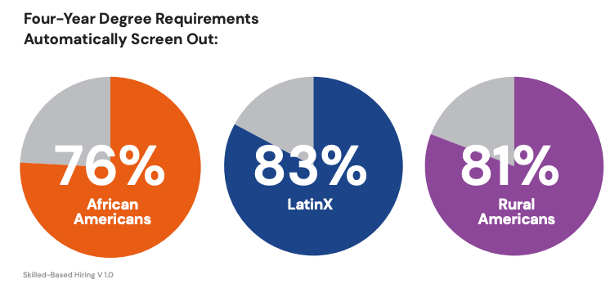 Skills-based hiring is a method that focuses on a candidate’s skills rather than their background. According to Opportunity@Work, four-year degree requirements automatically screen out 76 percent of African Americans, 83 percent of LatinX, and 81 percent of rural Americans.
